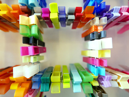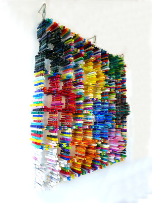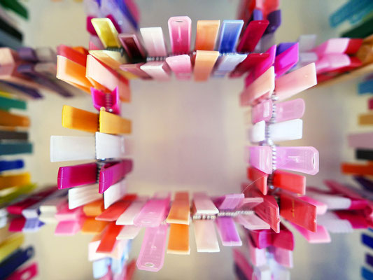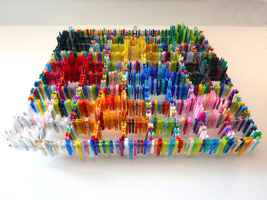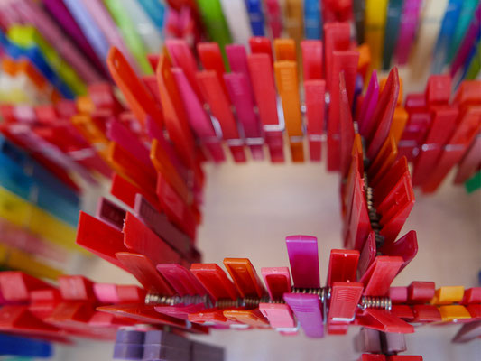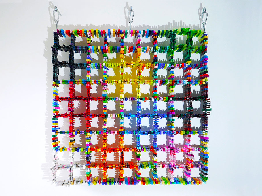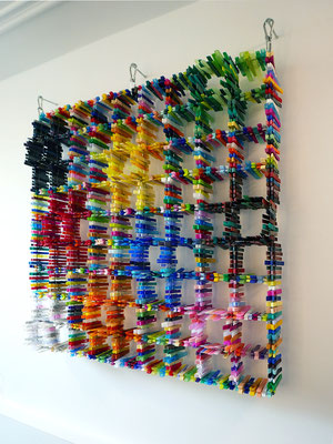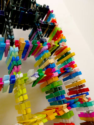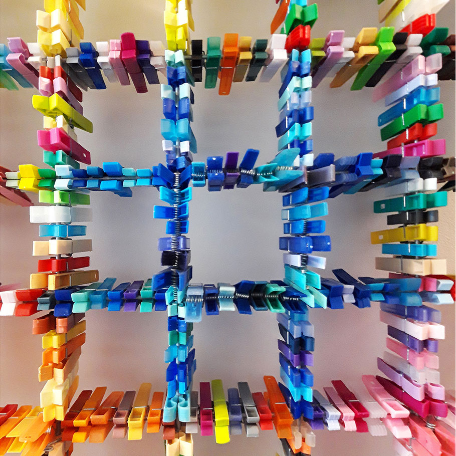 materials: plastic clothespins, steel grid, carabiners, screw eyes