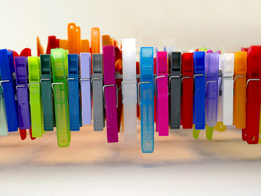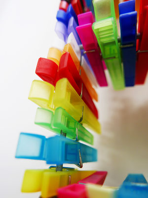 materialen: plastic wasknijpers, stalen rooster, karabijnhaken, schroefogen